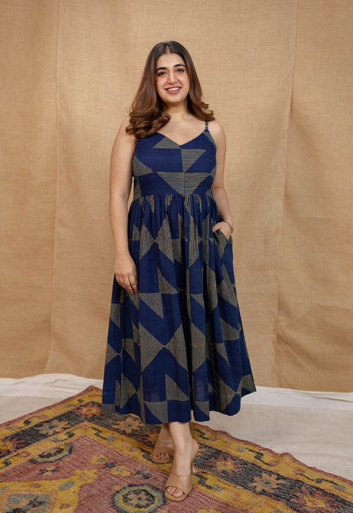 Eliya Indigo Ajrakh Cotton A Line Dress